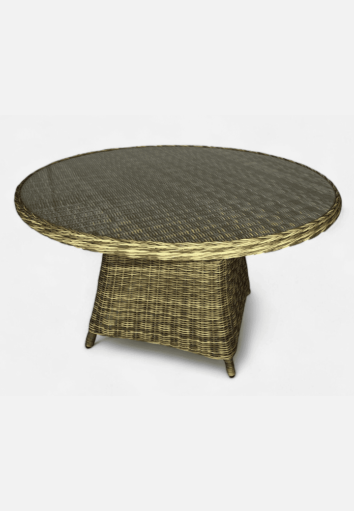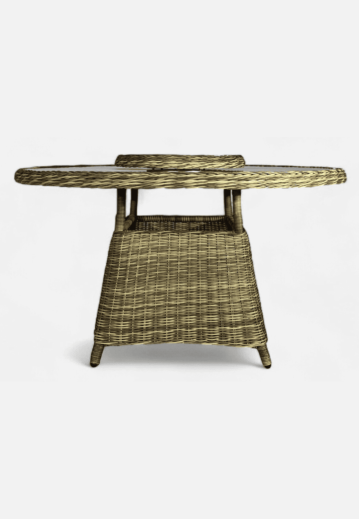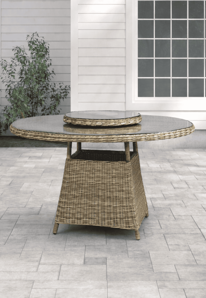 • Mesa de comedor redonda fabricada en ratán sintético trenzado sobre estructura interna de aluminio.
