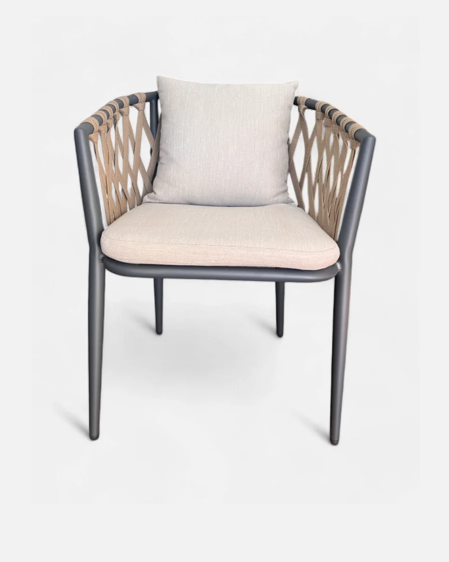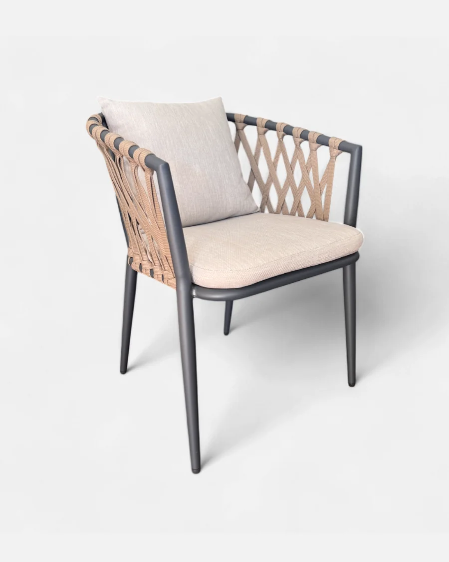 La Silla Índigo no es solo una silla de exterior, es una pieza pensada para dar coherencia estética a un comedor de jardín cuidado. La combinación del aluminio antracita con la cuerda beige crea un contraste elegante que aporta profundidad visual sin resultar pesado.