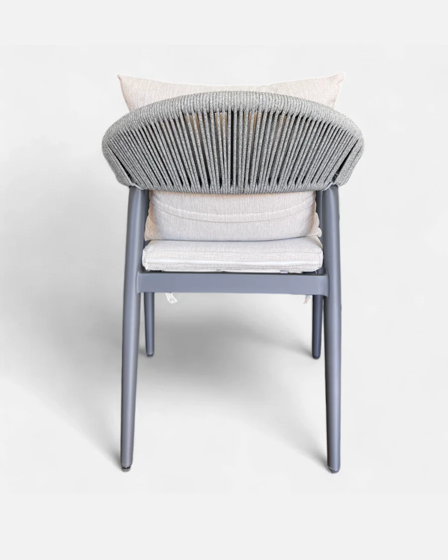 · El trenzado en cuerda sintética gris envuelve el respaldo generando ventilación natural y una sensación de confort visual y ergonómico.