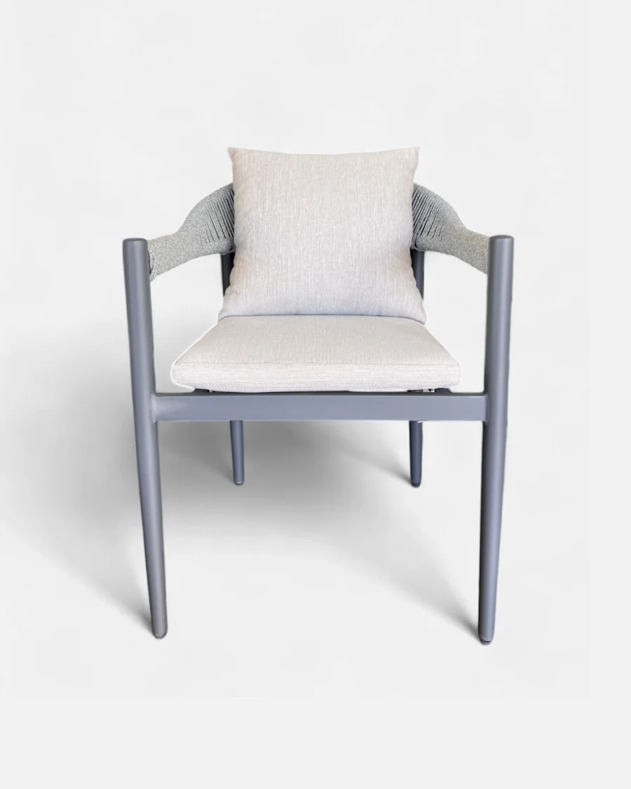 La silla Ocean destaca por su equilibrio entre diseño ligero y robustez estructural. El aluminio con acabado en polvo garantiza una excelente resistencia a la corrosión, mientras que la cuerda sintética trenzada proporciona una sentada confortable y transpirable.