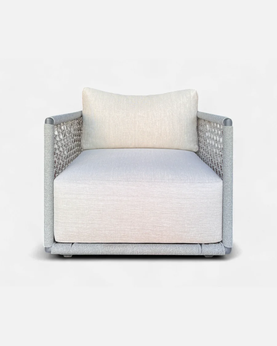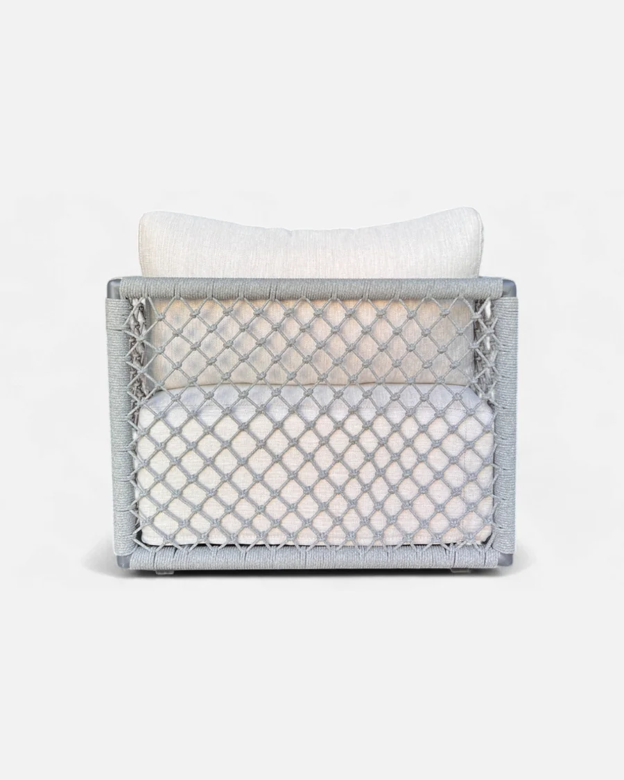 El sillón Ocean está concebido para integrarse con naturalidad en ambientes exteriores de estética moderna. La combinación de aluminio ligero con cuerda sintética trenzada no solo aporta personalidad visual, sino también ventilación y durabilidad frente al uso continuado en exterior.