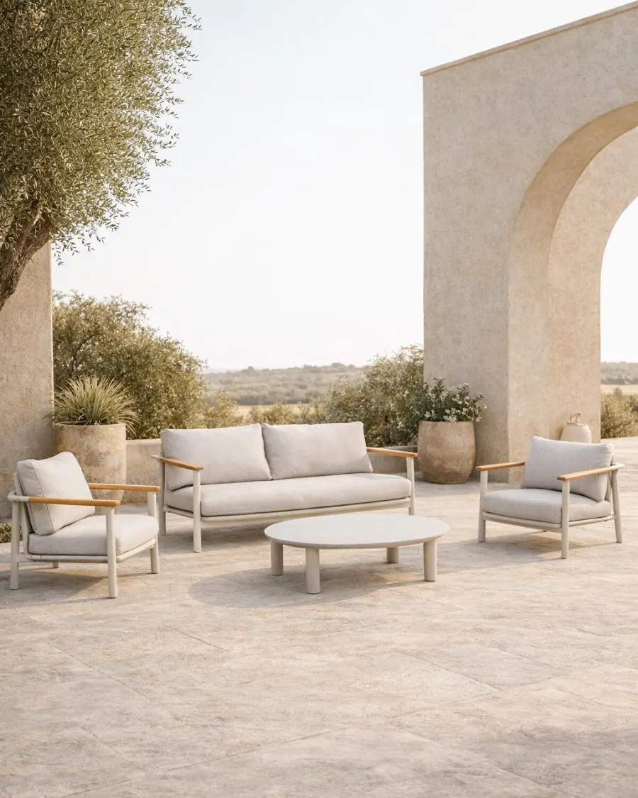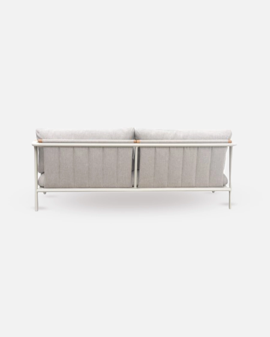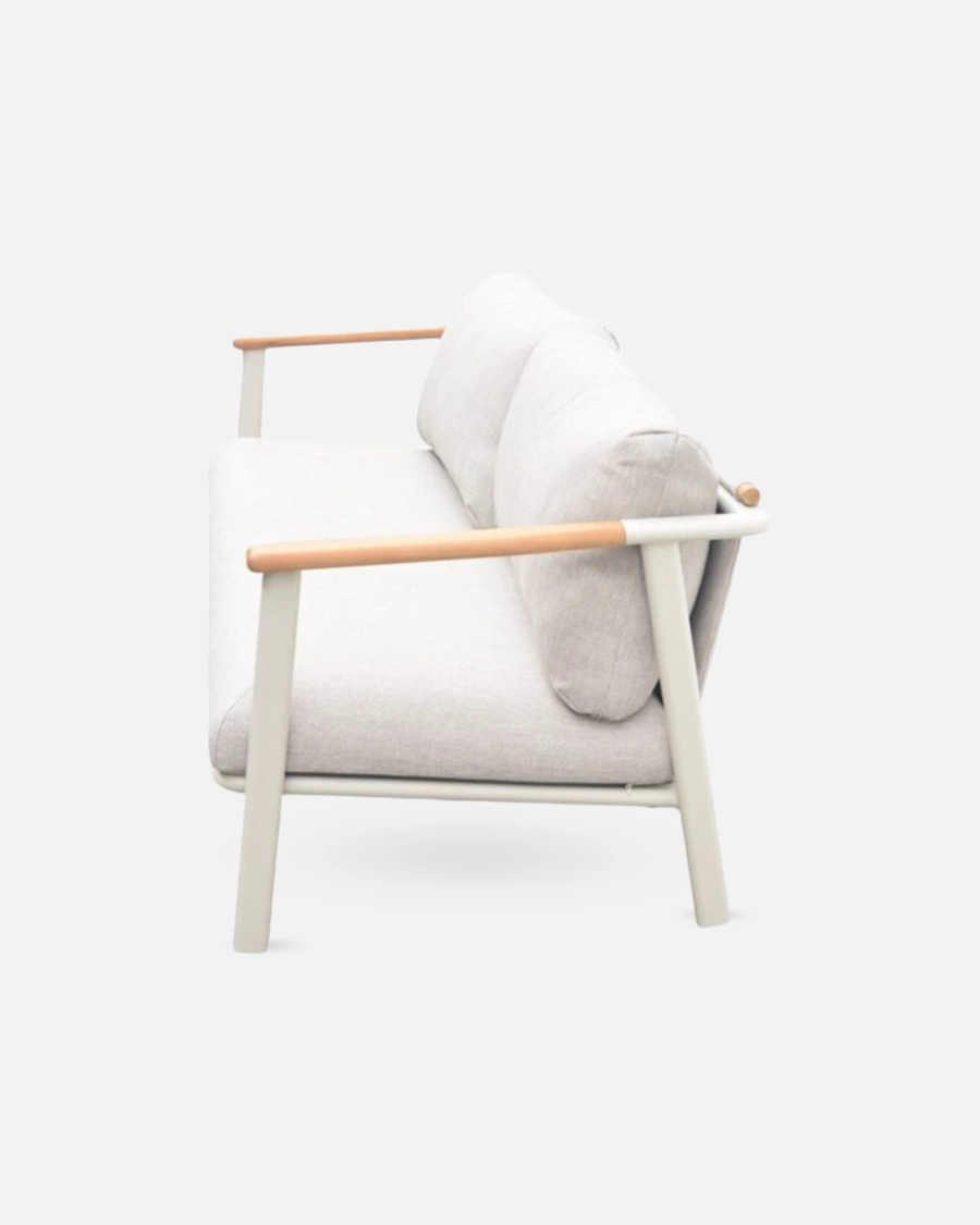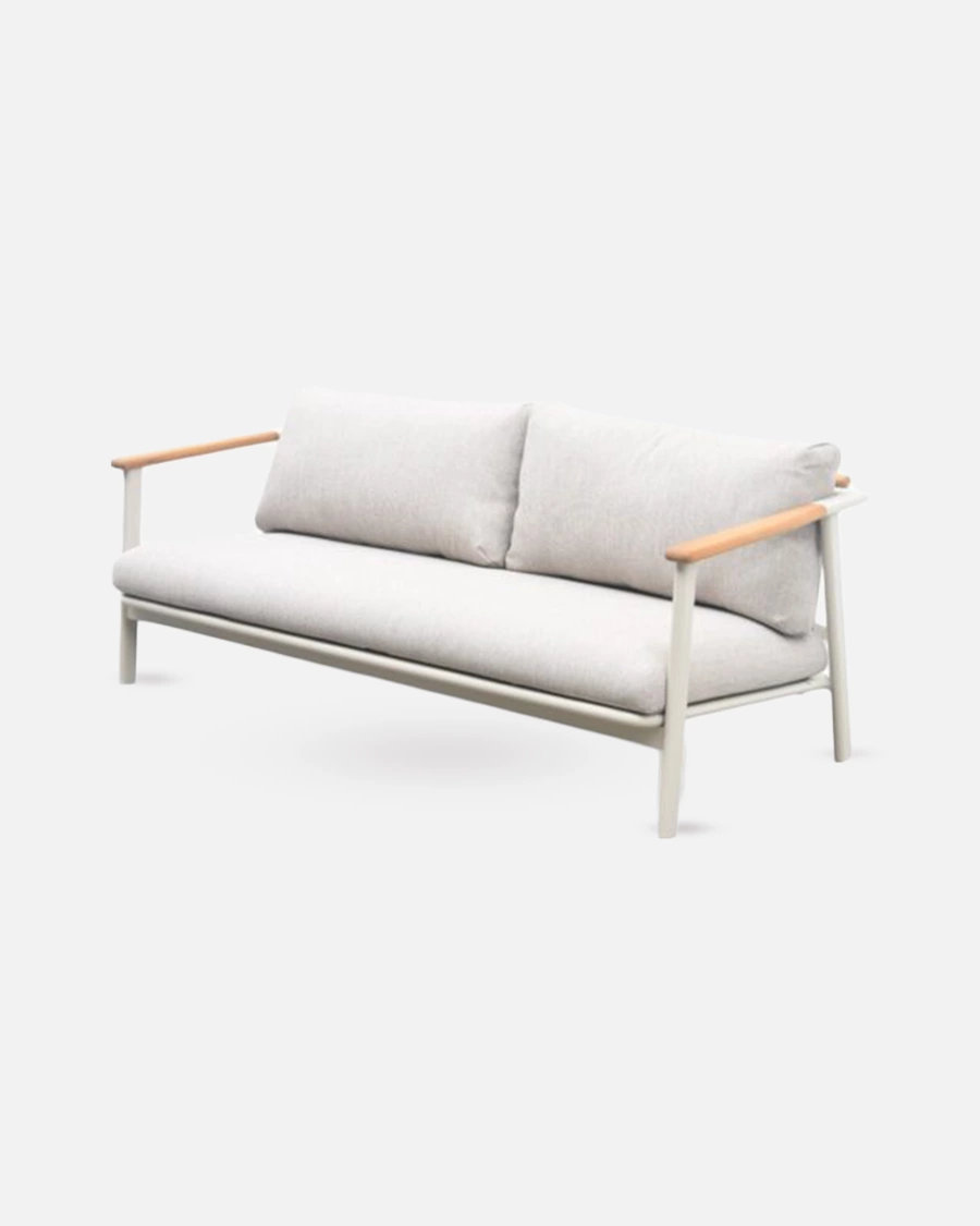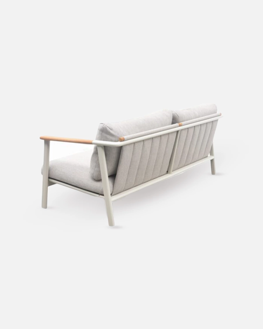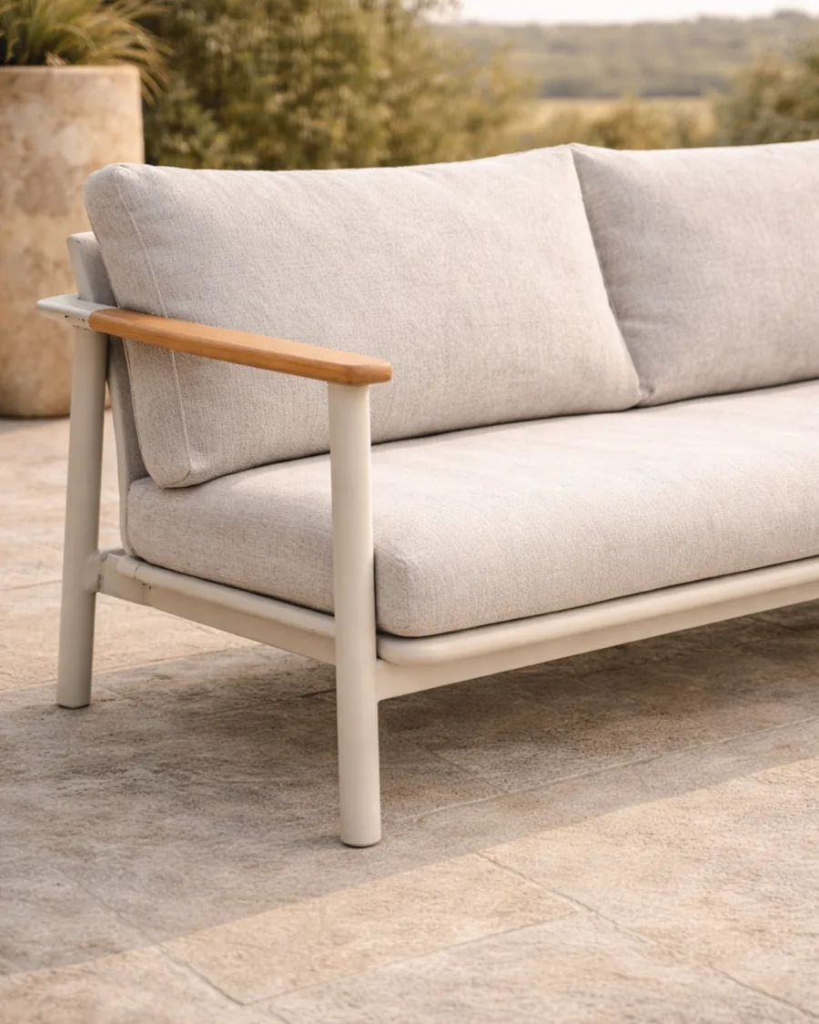 El Sofá Sand 3 plazas está concebido para espacios exteriores donde el diseño contemporáneo y la funcionalidad deben convivir. El aluminio aporta durabilidad y estabilidad estructural, mientras que la madera de teca introduce un detalle cálido que suaviza la estética minimalista del conjunto.