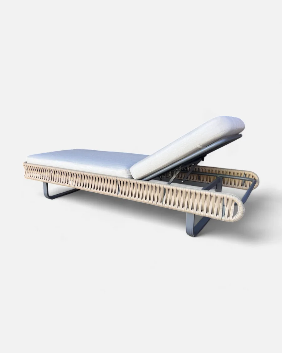 . La combinación de materiales crea una tumbona ligera visualmente pero sólida en su estructura, ideal para exteriores exigentes.